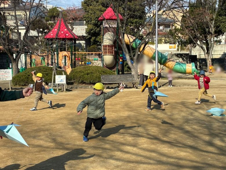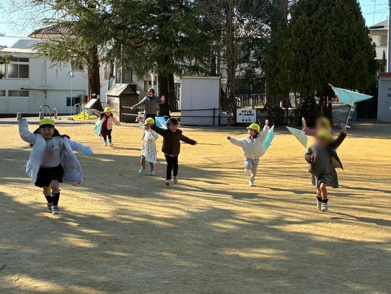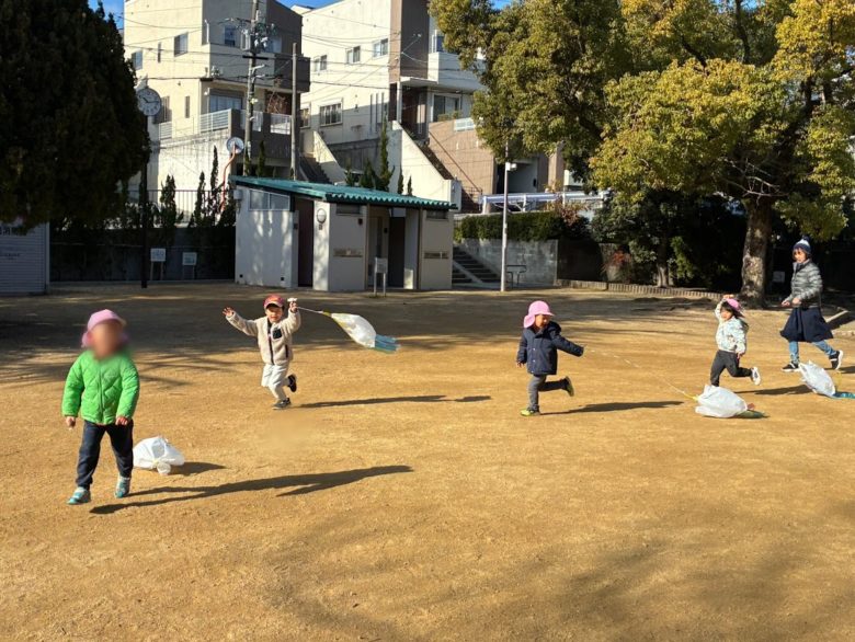 1月14日(水)には年少たんぽぽ組と年中ちゅうりっぷ組の子どもたちが凧あげを楽しみました。たんぽぽ組の子どもたちはビニール凧に空気が入り、自分で作った凧が飛ぶことをとても喜んでいました。