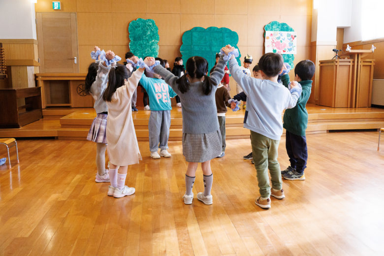 年中ちゅうりっぷ組には、ある日魔法使いから手紙が届き、そこから話が膨らんで、「魔法のおふろ」というお話で劇遊びがはじまりました。『魔法でどんなお風呂を作りたい?』『みんなでお風呂を表現するにはどうやったらいいかな?』子どもたちと意見を交換しながら、少しずつ劇が出来上がっていきました。みんなで手をつないで大きなお風呂を作る場面、歌声も大きくなって、楽しさが伝わってきました。