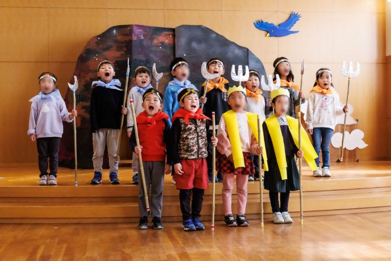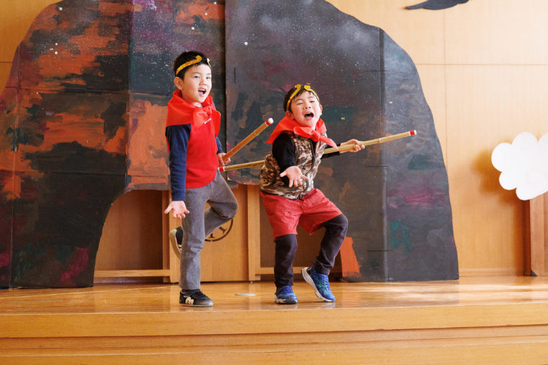 年長ひまわり組は、「西遊記」を題材として取り組んできました。お話の魅力がぐっと広がる可能性を信じて、素話でお話を伝えてきました。それぞれの登場人物の個性や、各場面のイメージなど、子どもたちの想像力が存分に発揮された劇になりました。歌の持つ印象も、子どもたちのイメージを膨らませ、楽しく嬉しいだけではない、怖く、恐ろしい表現も、歌声を通して表現を楽しんでいました。